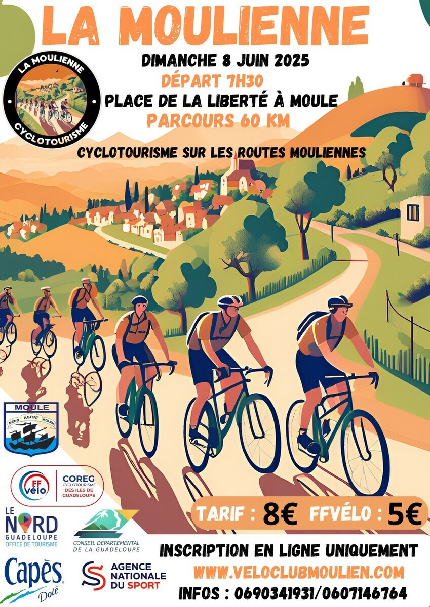 L’association Le Vélo Club Moulien organise la cyclotouriste « La Moulienne » le 8 juin 2025. C’est une manifestation organisée sous l’égide de la Fédération Française de Cyclotourisme (FFCT). Elle propose un circuit de cyclotouriste ouverte aux débutants et aux plus expérimentés sur les routes du territoire de la ville du Moule à 95%, à 2% sur la commune de Sainte Anne et 3% sur la commune de Morne à l'eau.